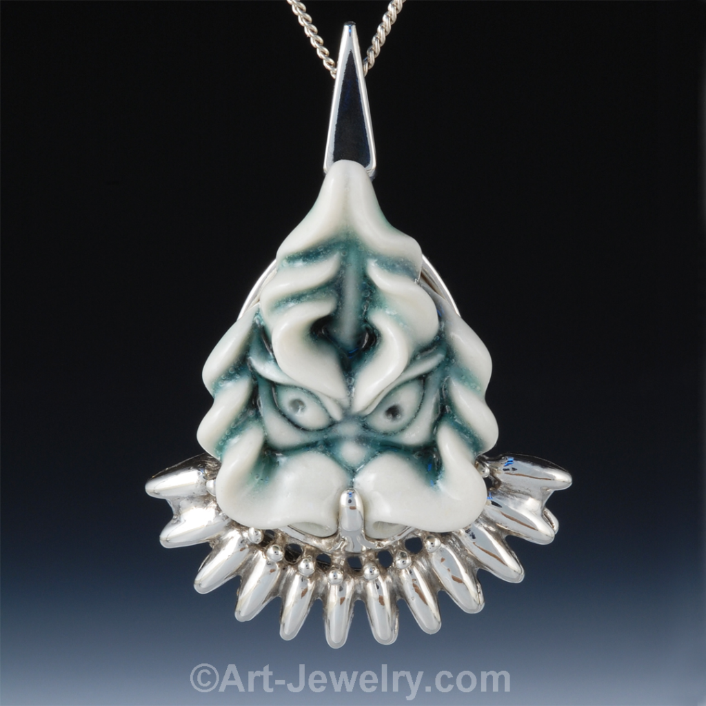 Porcelain Dragon Face Necklace in Sterling Silver with Spiral Wings